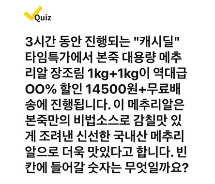 3시간 동안 진행되는 "캐시딜" 타임특가에서 본죽 대용량 메추리알 장조림 1kg+1kg이 역대급 OO%할인 14500원+무료배송에 진행됩니다. 이 메추리알은 본죽만의 비법소스로 감칠맛 있게 조려낸 신산한 국내산 메추리알으로 더욱 맛있다고 합니다. 빈 칸에 들어갈 숫자는 무엇일까요?