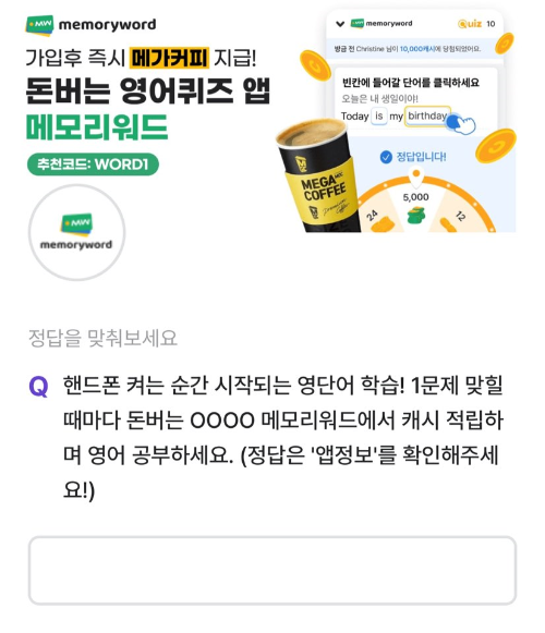 Q. 핸드폰 켜는 순간 시작되는 영단어 학습! 1문제 맞힐때마다 돈버는 OOOO 메모리워드에서 캐시 적립하며 영어 공부하세요.