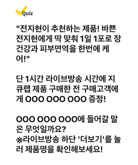 "전지현이 추천하는 제품! 바쁜 전지현에게 딱 맞춰 1일 1포로 장건강과 피부면역을 한번에 케어!" 단 1시간 라이브방송 시간에 지큐랩 제품 구매한 전 구매고객에게 OOO OOO OOO 증정! OOO OOO OOO에 들어갈 말은 무엇일까요?