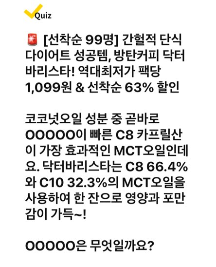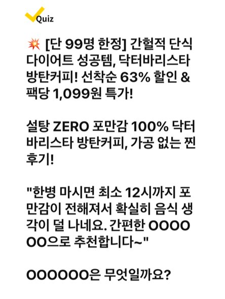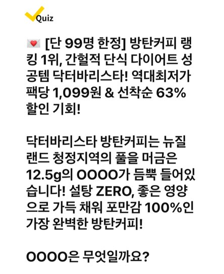 [단 99명 한정] 간헐적 단식 다이어트 성공템, 닥터바리스타 방탄커피! 선착순 63% 할인 & 팩당 1,099원 특가! 닥터바리스타 방탄커피는 원두의 풍미가 담기고 한국사람들의 입맛에 맞추면서도 좋은 영양과 OOOOOOO는 그대로 담았어요. 설탕 ZERO, 포만감 100% 완벽한 방탄커피로 다이어트하세요! OOOOOOO는 무엇일까요?