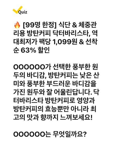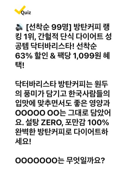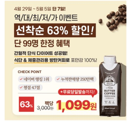 [단 99명 한정] 간헐적 단식 다이어트 성공템, 닥터바리스타 방탄커피! 선착순 63% 할인 & 팩당 1,099원 특가! OOOOOO가 선택한 풍부한 원두의 바디감, 방탄커피는 낮은 산미와 부드러운 바디감을 가진 원두와 잘 어울린답니다. 닥터바리스타 방탄커피로 영양과 방탄커피의 효능뿐만 아니라 최고의 맛과 향까지 느껴보세요! OOOOOO는 무엇일까요?