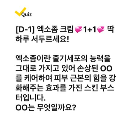 [D-1] 엑소좀 크림 1+1 딱 하루 서두르세요! 엑소좀이란 줄기세포의 능력을 그대로 가지고 있어 손상된 OO를 케어하여 피부 근본의 힘을 강화해주는 효과를 가진 스킨부스터입니다. OO는 무엇일까요?