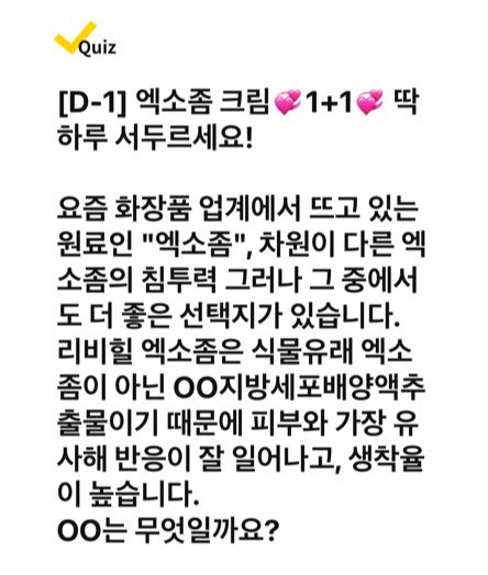 [D-1] 엑소좀 크림 1+1 딱 하루 서두르세요! 요즘 화장품 업계에서 뜨고 있는 원료인 "엑소좀", 차원이 다른 엑소좀의 침투력 그러나 그 중에서도 더 좋은 선택지가 있습니다. 리비힐 엑소좀은 식물유래 엑소좀이 아닌 OO지방세포배양액추출물이기 때문에 피부와 가장 유사해 반응이 잘 일어나고, 생착율이 높습니다. OO는 무엇일까요?