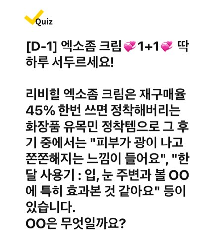 [D-1] 엑소좀 크림 1+1 딱 하루 서두르세요! 리비힐 엑소좀 크림은 재구매율 45% 한번 쓰면 정착해버리는 화장품 유목민 정착템으로 그 후기 중에서는 "피부가 광이 나고 쫀쫀해지는 느낌이 들어요", "한 달 사용기 : 입, 눈 주변과 볼 OO에 특히 효과본 것 같아요" 등이 있습니다. OO은 무엇일까요?