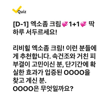 [D-1] 엑소좀 크림 1+1 딱 하루 서두르세요! 리비힐 엑소좀 크림! 이런 분들에게 추천합니다. 속건조와 거친 피부결이 고민이신 분, 단기간에 확실한 효과가 입증된 OOOO을 찾고 계신 분. OOOO은 무엇일까요?
