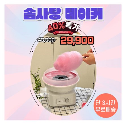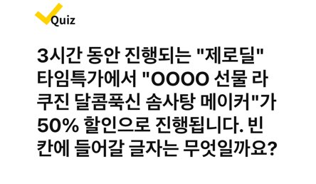 3시간 동안 진행되는 "제로딜" 타임특가에서 "OOOO 선물 라쿠진 달콤푹신 솜사탕 메이커"가 50% 할인으로 진행됩니다. 빈 칸에 들어갈 글자는 무엇일까요?