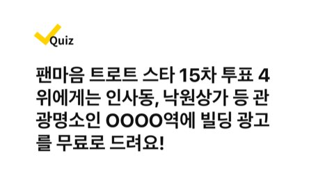 팬마음 트로트 스타 15차 투표 4위에게는 인사동, 낙원상가 등 관광명소인 OOOO역에 빌딩 광고를 무료로 드려요!