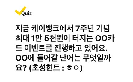 지금 케이뱅크에서 7주년 기념 최대 1만 5천원이 터지는 OO카드 이벤트를 진행하고 있어요. OO에 들어갈 단어는 무엇일까요? (초성힌트 : ㅎㅇ)