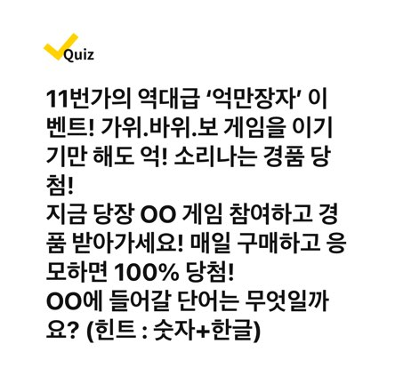 11번가의 역대급 '억만장자' 이벤트! 가위.바위.보 게임을 이기기만 해도 억! 소리나는 경품 당첨! 지금 당장 OO 게임 참여하고 경품 받아가세요! 매일 구매하고 응모하면 100% 당첨! OO에 들어갈 단어는 무엇일까요? (힌트:숫자+한글)