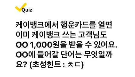 케이뱅크에서 행운카드를 열면 이미 케이뱅크를 쓰는 고객님도 OO 1,000원을 받을 수 있어요. OO에 들어갈 단어는 무엇일까요? (초성힌트 : ㅊㄷ)