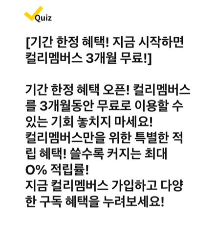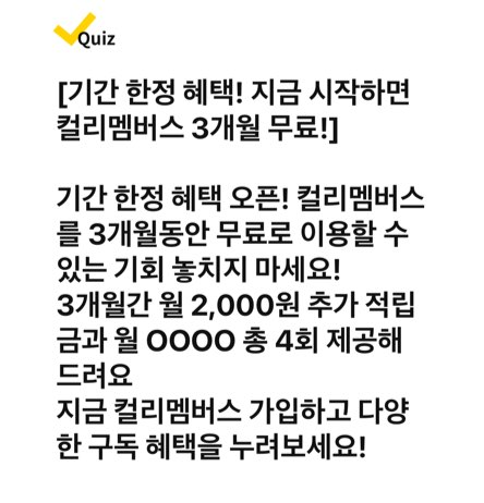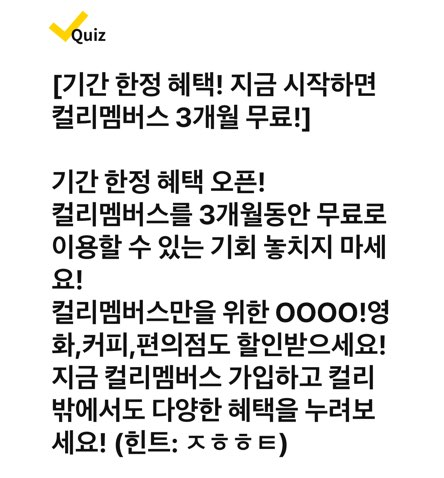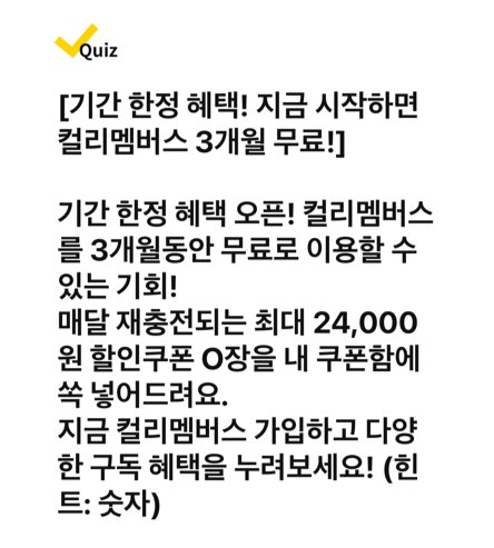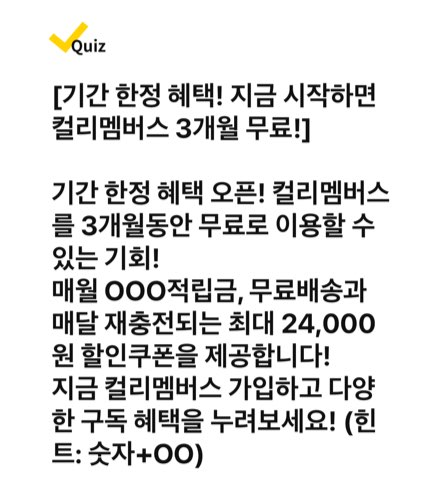 ✅ [기간 한정 혜택! 지금 시작하면 컬리멤버스 3개월 무료!] 기간 한정 혜택 오픈! 컬리멤버스를 3개월동안 무료로 이용할 수 있는 기회 놓치지 마세요! 컬리멤버스만을 위한 OOOO! 영화, 커피, 편의점도 할인받으세요! 지금 컬리멤버스 가입하고 컬리 밖에서도 다양한 혜택을 누려보세요! (힌트: ㅈㅎㅎㅌ)