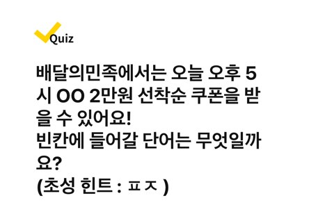 ✅ 배달의민족에서는 오늘 오후 5시 OO 2만원 선착순 쿠폰을 받을 수 있어요! 빈칸에 들어갈 단어는 무엇일까요? (초성힌트 : ㅍㅈ)