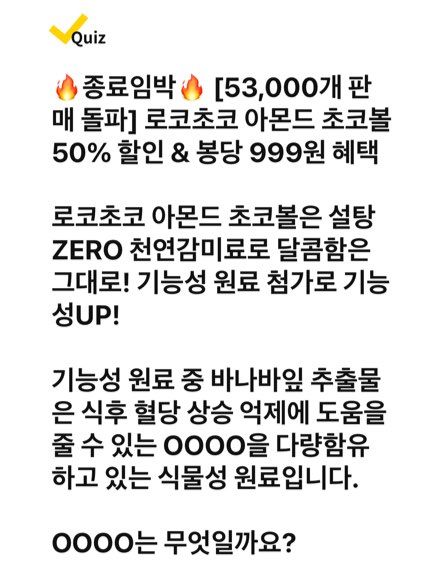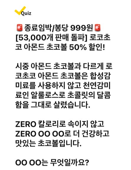 ✅ 🚨종료임박/봉당 999원🚨[53,000개 판매 돌파] 로코초코 아몬드 초코볼 50% 할인! 아직도 "무설탕"에 속고 있나요? 설탕ZERO라고 다 같은 무설탕이 아닙니다! 로코초코 아몬드 초코볼은 청량하고 OOO 단 맛을 내는 천연감미료인 알룰로스를 사용하여 칼로리는 빼고 달콤함은 그대로 살렸어요. 혈당 걱정 없이 달~콤하게! OOO는 무엇일까요?