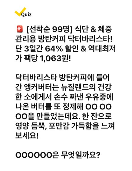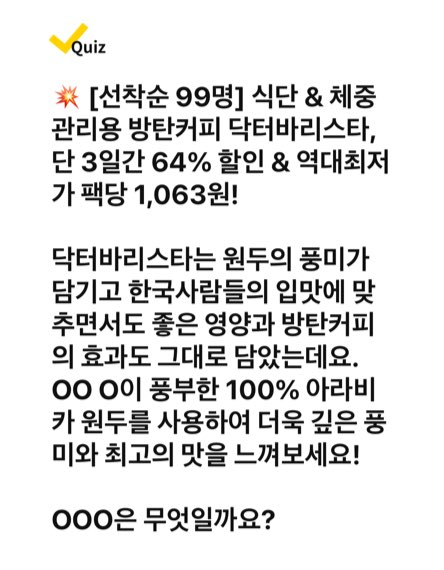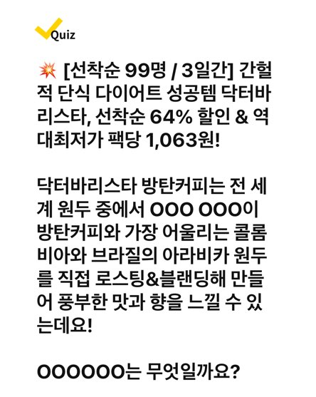 ✅ [단 99명 한정] 식단&체중 관리용 방탄커피 닥터바리스타, 단 3일간 64% 할인 & 역대 최저가 팩당 1,063원! 닥터바리스타는 원두의 풍미가 담기고 한국사람들의 입맛에 맞추면서도 좋은 영양과 방탄커피의 효과도 그대로 담았는데요. 이제 닥터바리스타 한잔으로 공복에 OOOOO 건강하게 체중관리 해보세요! OOOOO은 무엇일까요?