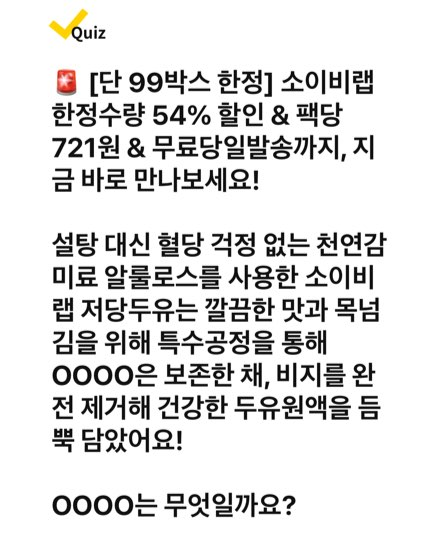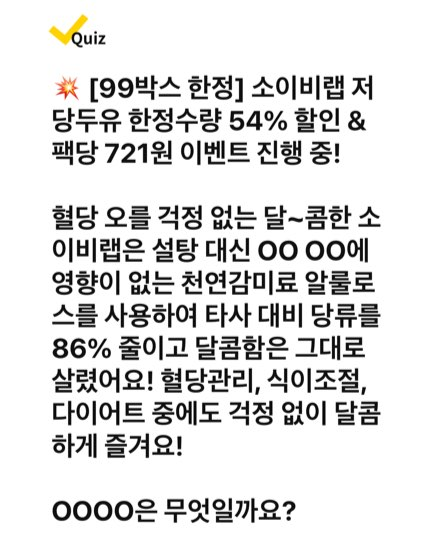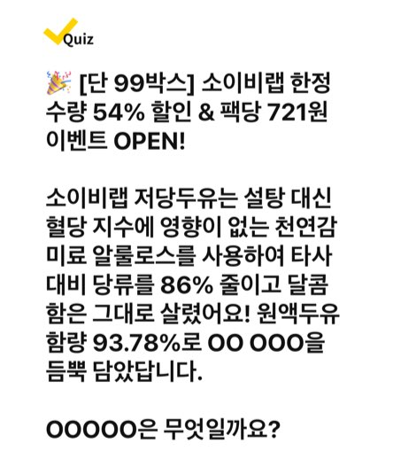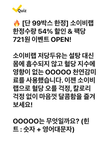 ✅ [단 99박스 한정] 소이비랩 한정수량 54% 할인 & 팩당 721원 이벤트 OPEN! 소이비랩 저당두유는 설탕 대신 몸에 흡수되지 않고 혈당 지수에 영향이 없는 OOOOO 천연감미료를 사용했습니다. 이젠 소이비랩으로 혈당 오를 걱정, 칼로리 걱정 없이 마음껏 달콤함을 즐겨 보세요! OOOOO는 무엇일까요? (힌트 : 숫자+영어대문자)