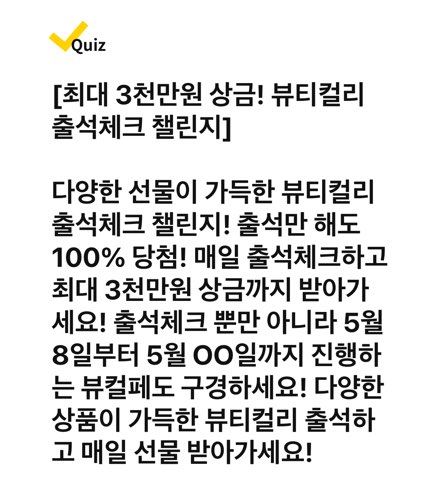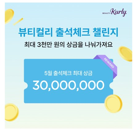 ✅ [최대 3천만원 상금! 뷰티컬리 출석체크 챌린지] 다양한 선물이 가득한 뷰티컬리 출석체크 챌린지! 출석만 해도 100% 당첨! 매일 출석체크하고 최대 3천만원 상금까지 받아가세요! 출석체크 뿐만 아니라 5월 8일부터 5월 OO일까지 진행하는 뷰컬페도 구경하세요! 다양한 상품이 가득한 뷰티컬리 출석하고 매일 선물 받아가세요!