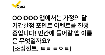 ✅ OOOOO앱에서는 가정의 달 기간한정 포인트 인벤트를 진행 중입니다! 빈칸에 들어갈 앱 이름은 무엇일까요? ( 초성힌트 : ㅌㅌㄹㅇㅌ)