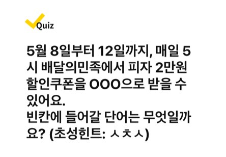 ✅ 5월 8일부터 12일까지, 매일 5시 배달의민족에서 피자 2만원 할인쿠폰을 OOO으로 받을 수 있어요. 빈칸에 들어갈 단어는 무엇일까요? (초성힌트 : ㅅㅊㅅ)