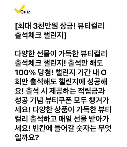 ✅ [최대 3천만원 상금! 뷰티컬리 출석체크 챌린지] 다양한 선물이 가득한 뷰티컬리 출석체크 챌린지! 출석만 해도 100% 당첨! 챌린지 기간 내 O회만 출석해도 챌린지에 성공해요! 출석 시 제공하는 적립금과 성공 기념 뷰티쿠폰 모두 챙겨가세요! 다양한 상품이 가득한 뷰티컬리 출석하고 매일 선물 받아가세요! 빈칸에 들어갈 숫자는 무엇일까요?