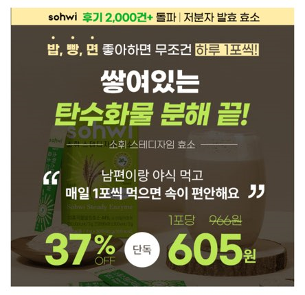 ✅ 70만포 전량 완판! "돌고돌아 결국 찾는건 소휘 소화효소였어요" 밥, 빵,면 좋아하면 무조건 하루 1포씩만 드세요 🔥단 99명 한정 1포 605원 🔥 탄수화물, 단백질 2종 분해! 소휘 효소는 OOO의 식습관에 맞추어 탄수화물 분해효소의 균형을 맞추었습니다. 식후 1포 습관으로 속편한 하루 되세요! 여기서 OOOO은?