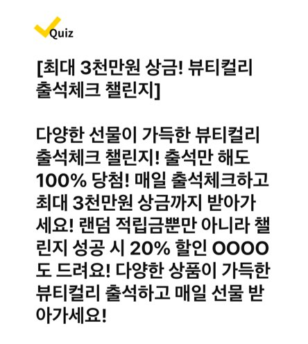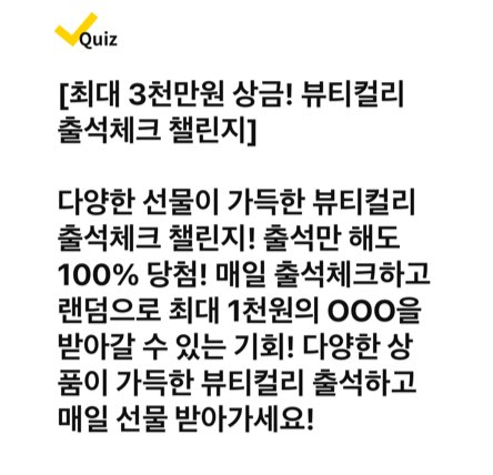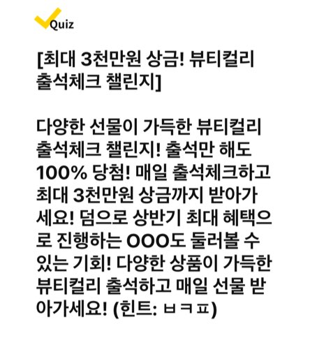 ✅ [최대 3천만원 상금! 뷰티컬리 출석체크 챌린지] 다양한 선물이 가득한 뷰티컬리 출석체크 챌린지! 출석만 해도 100% 당첨! 매일 출석체크하고 최대 3천만원 상금까지 받아가세요! 덤으로 상반기 최대 혜택으로 진행하는 OOO도 둘러볼 수 있는 기회! 다양한 상품이 가득한 뷰티컬리 출석하고 매일 선물 받아가세요! (힌트 : ㅂㅋㅍ)