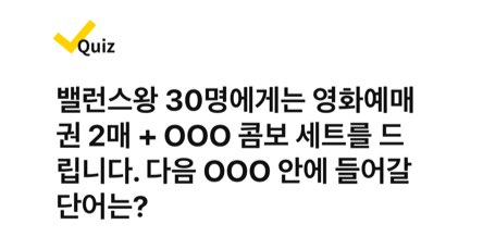 ✅ 밸런스왕 30명에게는 영화예매권 2매 + OOO 콤보세트를 드립니다. 다음 OOO안에 들어갈 단어는?