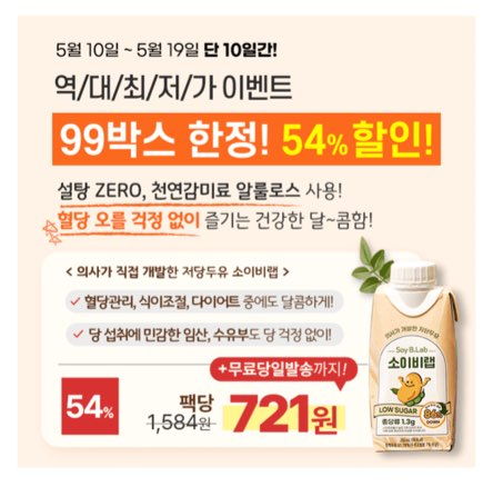 ✅ [단 99박스 한정] 소이비랩 한정수량 54% 할인 & 팩당 721원 이벤트 진행중! 혈당 오를 걱정 없는 달~콤한 소이비랩은 설탕 대신 OOOO에 영향이 없는 천연감미료 알룰로스를 사용하여 타사 대비 당류를 86% 줄이고 달콤함은 그대로 살렸어요! 혈당관리, 식이조절, 다이어트 중에도 걱정 없이 달콤하게 즐겨요!