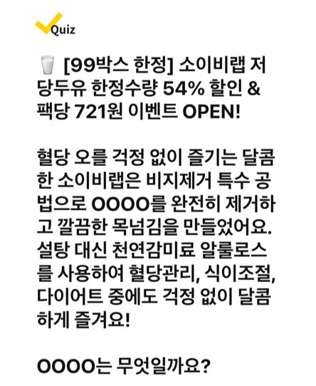 ✅ [단 99박스 한정] 소이비랩 한정수량 54% 할인 & 팩당 721원 이벤트 OPEN! 혈당 오를 걱정 없이 즐기는 달콤한 소이비랩은 비지제거 특수 공법으로 OOOO를 완전히 제거하고 깔끔한 목넘김을 만들었어요. 설탕 대신 천연감미료 알룰로스를 사용하여 혈당관리, 식이조절, 다이어트 중에도 걱정 없이 달콤하게 즐겨요! OOOO는 무엇일까요?