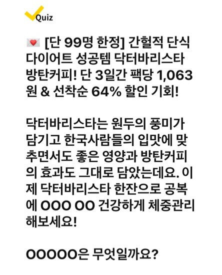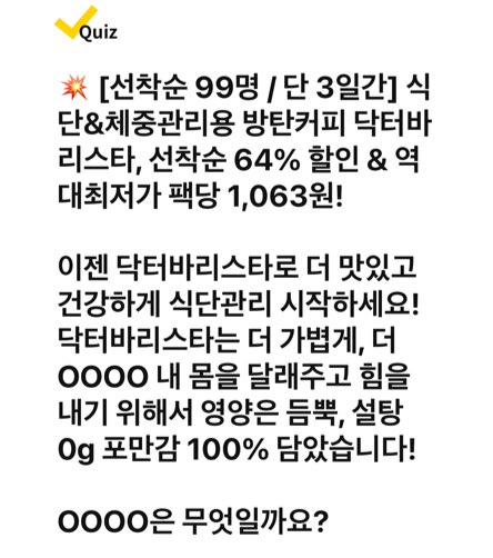 ✅ [선착순 99명 / 단 3일간] 식단&체중 관리용 방탄커피 닥터바리스타, 단 3일간 64% 할인 & 역대 최저가 팩당 1,063원! 이젠 닥터바리스타로 더 맛있고 건강하게 식단관리 시작하세요! 닥터바리스타는 더 가볍게, 더 OOOO 내 몸을 달래주고 힘을 내기 위해서 영양은 듬뿍, 설탕 0g 포만감 100% 담았습니다! OOOO은 무엇일까요?