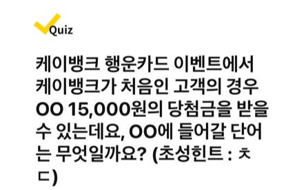 ✅ 케이뱅크 행운카드 이벤트에서 케이뱅크가 처음인 고객의 경우 OO 15,000원의 당첨금을 받을 수 있는데요, OO에 들어갈 단어는 무엇일까요? (초성힌트 : ㅊㄷ)