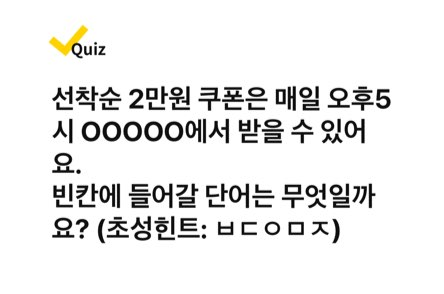 ✅ 선착순 2만원 쿠폰은 매일 오후 5시 OOOOO에서 받을 수 있어요. 빈칸에 들어갈 단어는 무엇일까요? (초성힌트 : ㅂㄷㅇㅁㅈ)