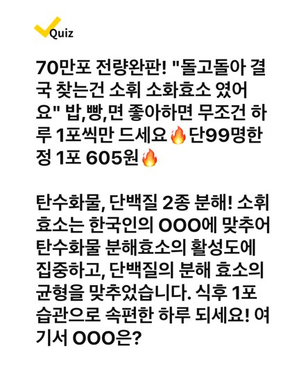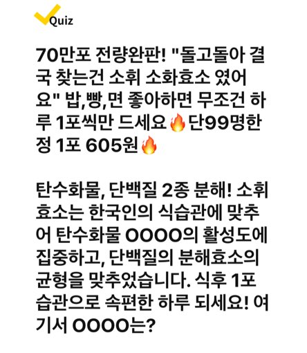✅ 70만포 전량 완판! "돌고돌아 결국 찾는건 소휘 소화효소였어요" 밥, 빵,면 좋아하면 무조건 하루 1포씩만 드세요 🔥단 99명 한정 1포 605원 🔥 탄수화물, 단백질 2종 분해! 소휘 효소는 한국인의 OOO에 맞추어 탄수화물 분해효소의 균형을 맞추었습니다. 식후 1포 습관으로 속편한 하루 되세요! 여기서 OOO은?