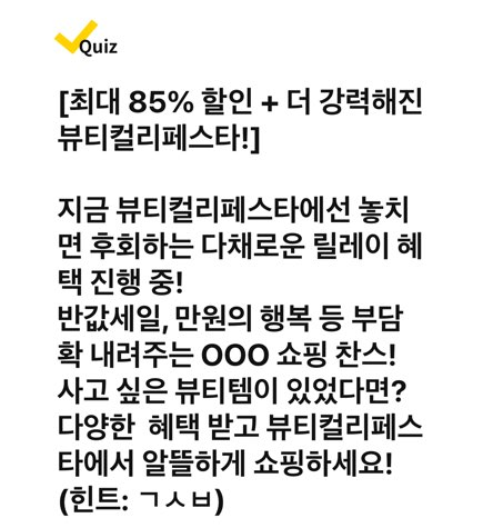 ✅ [최대 85% 할인 + 더 강력해진 뷰티컬리페스타!] 지금 뷰티컬리페스타에선 놓치면 후회하는 다채로운 릴레이 혜택 진행 중! 반값세일, 만원의 행복 등 부담 확 내려주는 OOO 쇼핑 찬스! 사고 싶은 뷰티템이 있었다면? 다양한 혜택 받고 뷰티컬리페스타에서 알뜰하게 쇼핑하세요! (힌트: ㄱㅅㅂ)