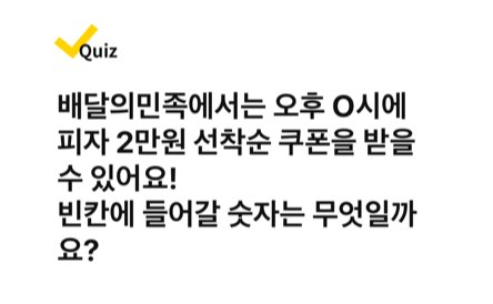 ✅ 배달의민족에서는 오후 O시에 피자 2만원 선착순 쿠폰을 받을 수 있어요! 빈칸에 들어갈 숫자는 무엇일까요?