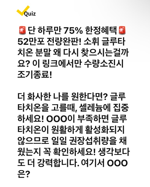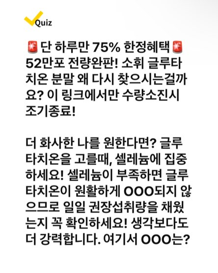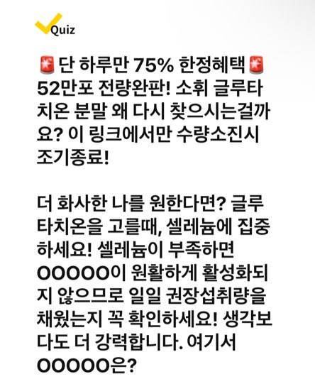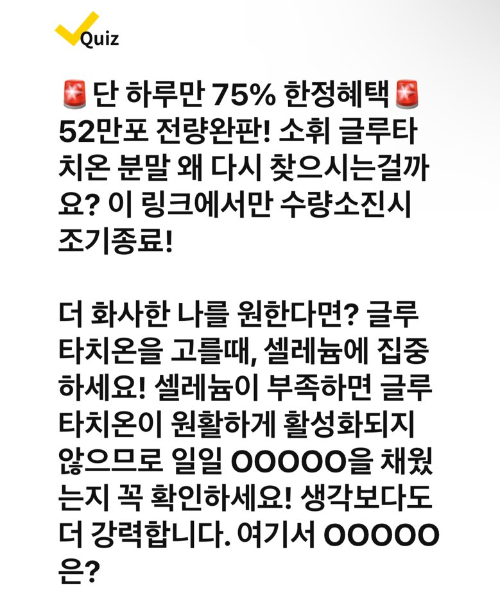🚨단 하루만 75% 한정혜택🚨52만포 전량 완판! 소휘 글루타치온 분말 왜 다시 찾으시는걸까요? 이 링크에서만 수량 소진시 조기 종료! 더 화사한 나를 원한다면? 글루타치온을 고를때, 셀레늄에 집중하세요! 셀레늄이 부족하면 OOOOO이 원활하게 활성화되지 않으므로 일일 권장섭취량을 채웠는지 꼭 확인하세요! 생각보다도 더 강력합니다. 여기서 OOOOO은?