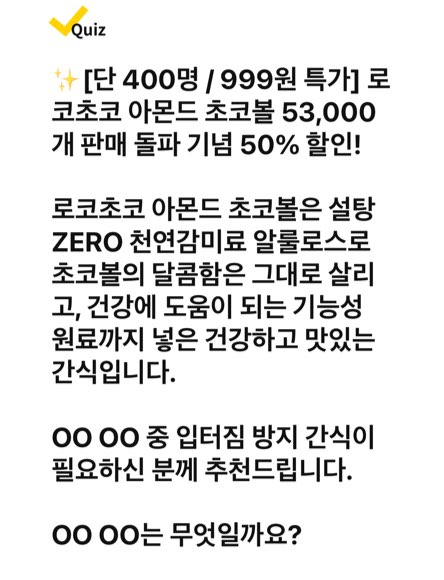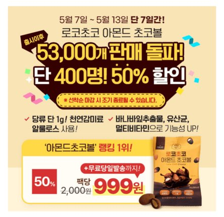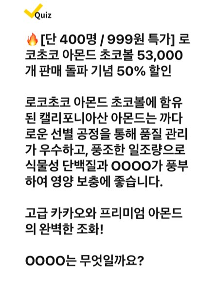 [단 400명/999원 특가] 로코초코 아몬드 초코볼 53,000원개 판매 돌파 기념 50% 할인 로코초코 아몬드 초코볼에 함유된 캘리포니아산 아몬드는 까다로운 선별 공정을 통해 품질관리가 우수하고, 풍조한 일조량으로 식물성 단백질과 OOOO가 풍부하여 영양 보충에 좋습니다. 고급 카카오와 프리미엄 아몬드의 완벽한 조화! OOOO는 무엇일까요?