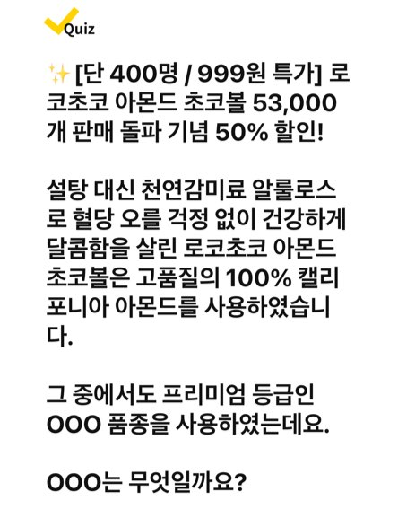 [단 400명/999원 특가] 로코초코 아몬드 초코볼 53,000원개 판매 돌파 기념 50% 할인! 설탕 대신 천연감미료 알룰로스로 혈당 오를 걱정 없이 건강하게 달콤함을 살린 로코초코 아몬드 초코볼은 고품질의 100% 캘리포니아 아몬드를 사용하였습니다. 그 중에서도 프리미엄 등급인 OOO 품종을 사용하였는데요. OOO는 무엇일까요?
