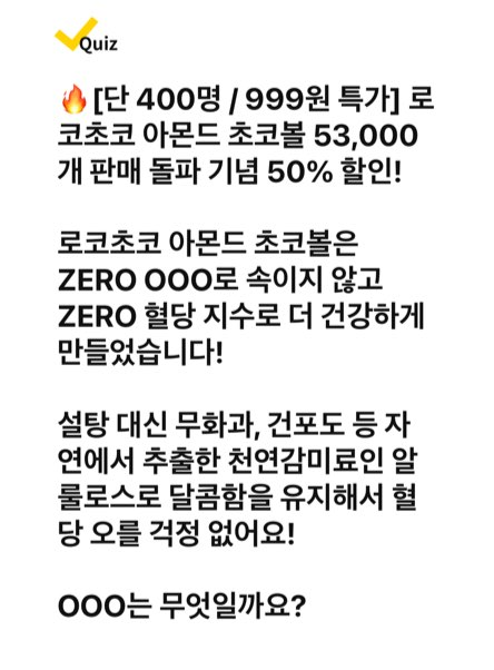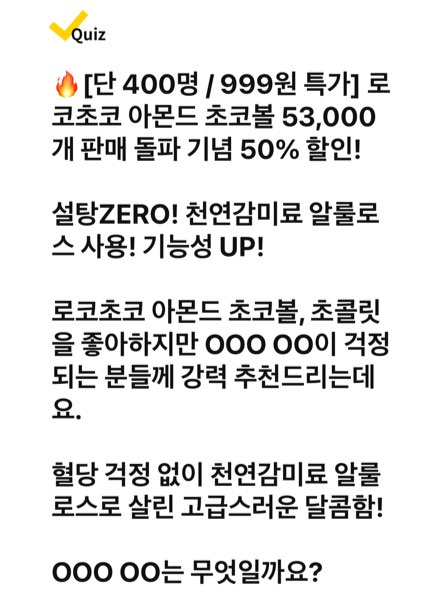 [단 400명/999원 특가] 로코초코 아몬드 초코볼 53,000원개 판매 돌파 기념 50% 할인! 로코초코 아몬드 초코볼은 ZERO OOOO로 속이지 않고 ZERO 혈당 지수로 더 건강하게 만들었습니다! 설탕 대신 무화과, 건포도 등 자연에서 추출한 천연감미료인 알룰로스로 달콤함을 유지해서 혈당 오를 걱정 없어요! OOO는 무엇일까요?
