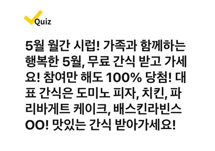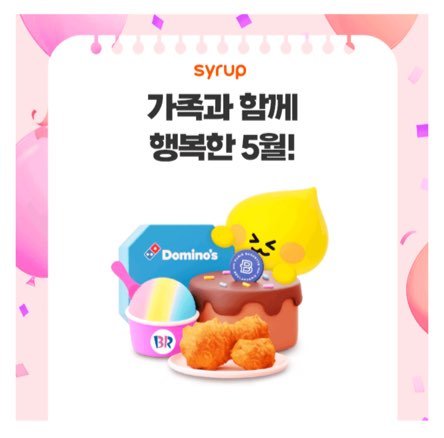 5월 월간 시럽! 가족과 함께하는 행복한 5월, 무료 간식 받고 가세요! 참여만 해도 100% 당첨! 대표 간식은 도미노피자, 치킨, 파리바게트 케이크, 배스킨라빈스 OO! 맛있는 간식 받아가세요!
