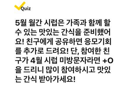 5월 월간 시럽은 가족과 함께할 수 있는 맛있는 간식을 준비했어요! 친구에게 공유하면 응모기회를 추가로 드려요! 단, 참여한 친구가 4월 시럽 미방문자라면 +O을 드리니 많이 참여하시고 맛있는 간식 받아가세요!
