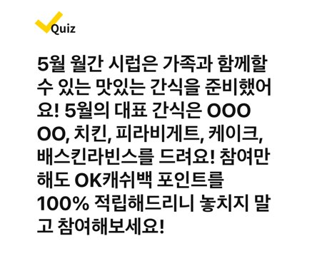 5월 월간 시럽은 가족과 함께할 수 있는 맛있는 간식을 준비했어요! 5월의 대표 간식은 OOOOO, 치킨, 피라비게트, 케이크, 배스킨라빈스를 드려요! 참여만 해도 OK캐쉬백 포인트를 100% 적립해드리니 놓치지 말고 참여해보세요!