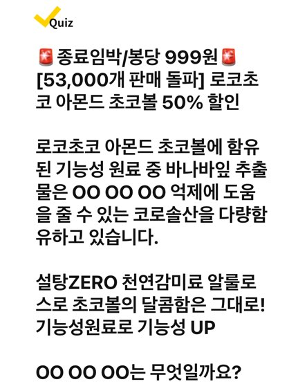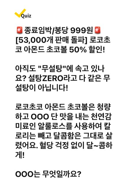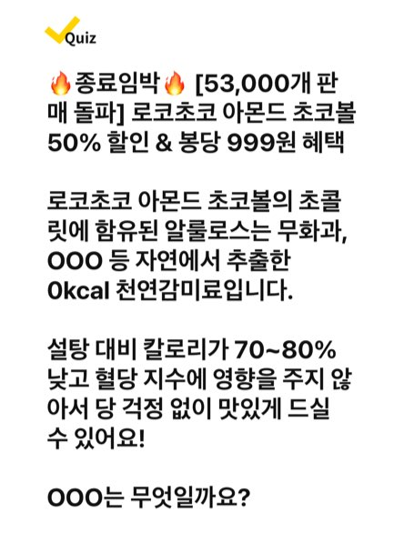 🚨종료임박/봉당 999원🚨[53,000개 판매 돌파] 로코초코 아몬드 초코볼 50% 할인! 아직도 "무설탕"에 속고 있나요? 설탕ZERO라고 다 같은 무설탕이 아닙니다! 로코초코 아몬드 초코볼은 청량하고 OOO 단 맛을 내는 천연감미료인 알룰로스를 사용하여 칼로리는 빼고 달콤함은 그대로 살렸어요. 혈당 걱정 없이 달~콤하게! OOO는 무엇일까요?