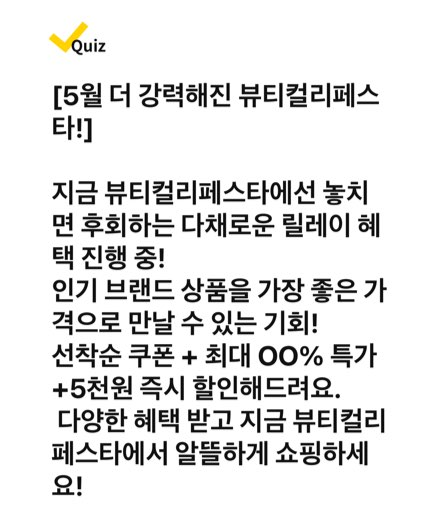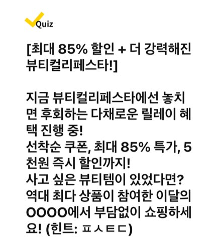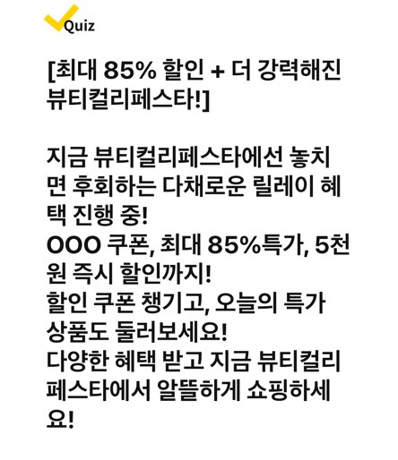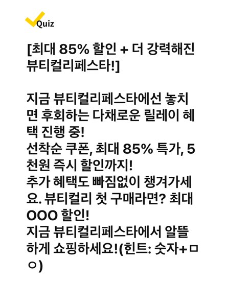 [최대 85% 할인 + 더 강력해진 뷰티컬리페스타!] 지금 뷰티컬리페스타에선 놓치면 후회하는 다채로운 릴레이 혜택 진행 중! 선착순 쿠폰, 최대 85%특가, 5천원 즉시 할인까지! 추가 혜택도 빠짐없이 챙겨가세요. 뷰티컬리 첫구매라면? 최대 OOO 할인! 지금 뷰티컬리페스타에서 알끌하게 쇼핑하세요! (힌트: 숫자+ㅁㅇ)