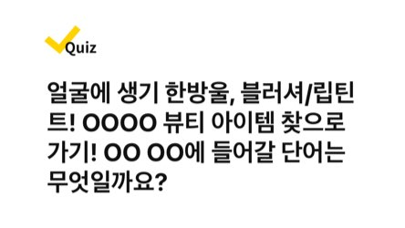 얼굴에 생기 한방울, 블러셔/립틴트! OOOO 뷰티 아이템 찾으로 가기! OOOO에 들어갈 단어는 무엇일까요?
