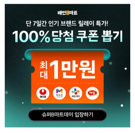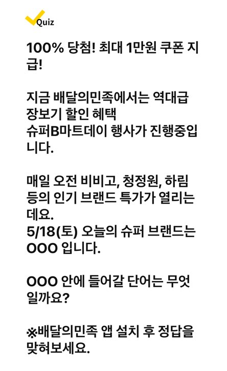 ✅ 100%당첨! 최대 1만원 쿠폰 지급! 지금 배달의민족에서는 역대급 장보기 할인 혜택 슈퍼B마트데이 행사가 진행중입니다. 매일 오전 비비고, 청정원, 하림 등의 인기 브랜드 특가가 열리는데요. 5/18(토) 오늘의 슈퍼 브랜드는 OOO입니다. OOO안에 들어갈 단어는 무엇일까요?