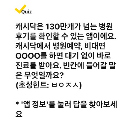 ✅ 캐시닥은 130만개가 넘는 병원 후기를 확인할 수 있는 앱이에요. 캐시닥에서 병원예약, 비대면 OOOO를 하면 대기 없이 바로 진료를 받아요. 빈칸에 들어갈 말은 무엇일까요? (초성힌트: ㅂㅇㅈㅅ)