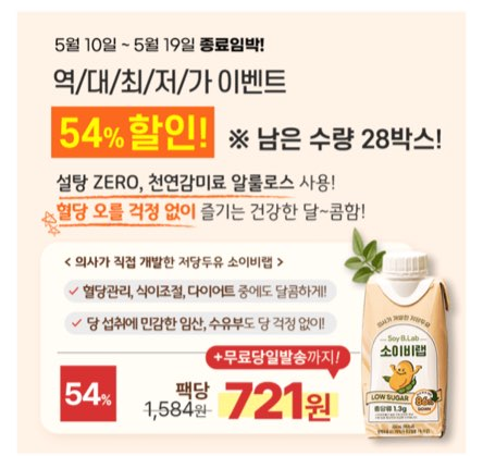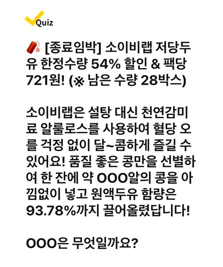 ✅ [남은 수량 단 28박스] 소이비랩 저당두유 한정수량 54% 할인 & 팩당 721원 종료 임박! 혈당 오를 걱정 없이 달콤한 소이비랩은 설탕 대신 몸에 흡수되지 않고 혈당 지수에 OOOOO 0Kcal 천연감미료를 사용했어요! 당류를 86% 낮추고 달콤함은 그대로~ 혈당관리, 식이조절, 다이어트 중에도 걱정 없이 달콤하게! OOOOO은 무엇일까요?