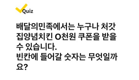 ✅ 배달의민족에서는 누구나 처갓집양념치킨 O천원 쿠폰을 받을 수 있습니다. 빈칸에 들어갈 숫자는 무엇일까요?