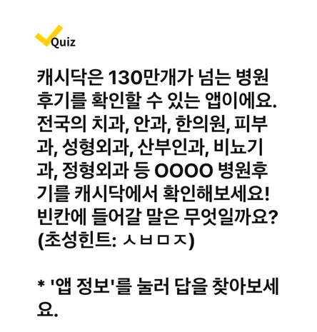 ✅ 캐시닥은 130만개가 넘는 병원 후기를 확인할 수 있는 앱이에요. 전국의 치과, 안과, 한의원, 피부과, 성형외과, 산부인과, 비뇨기과, 정형외과 등 OOOO 병원후기를 캐시닥에서 확인해보세요! 빈칸에 들어갈 말은 무엇일까요? (초성힌트: ㅅㅂㅁㅈ)