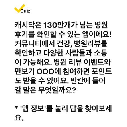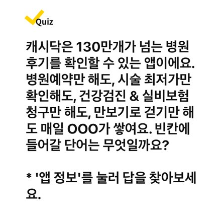 ✅ 캐시닥은 130만개가 넘는 병원 후기를 확인할 수 있는 앱이에요. 커뮤니티에서 건강, 병원리뷰를 확인하고 다양한 사람들과 소통이 가능해요. 병원 리뷰 이벤트와 만보기 OOO에 참여하면 포인트도 받을 수 있어요. 빈칸에 들어갈 말은 무엇일까요?